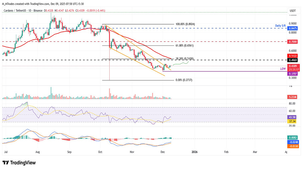 کاردانو سوم دسامبر موفق شد از الگوی «کنج نزولی» عبور کند، اما پس از افزایش اولیه با اصلاح مواجه شد و دوباره روی خط روند بالایی حمایت شد. رشد ۳.۷۱ درصدی روز دوشنبه نیز این بازیابی را تأیید کرد.
